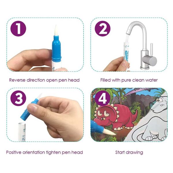 Cum? Este foarte simplu: desurubati si umpleti stiloul magic cu apa, apoi colorati pe pagini.