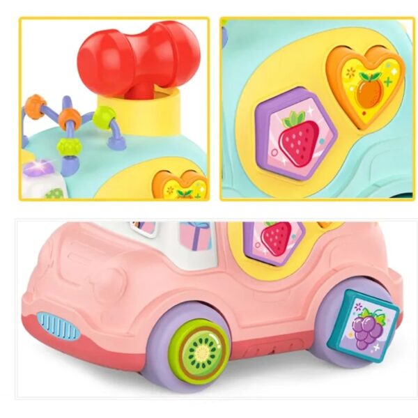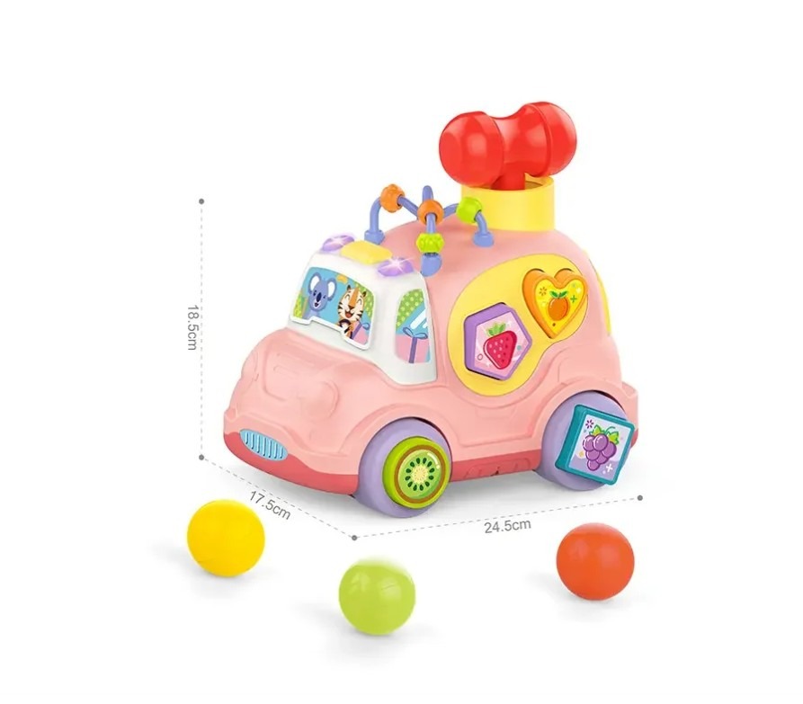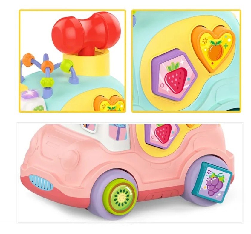 Această mașină interactivă roz cu sortator de forme, sunete și lumini este o jucărie educațională ideală pentru copiii cu vârsta de peste 18 luni, concepută pentru a stimula dezvoltarea cognitivă și motrică prin joacă.