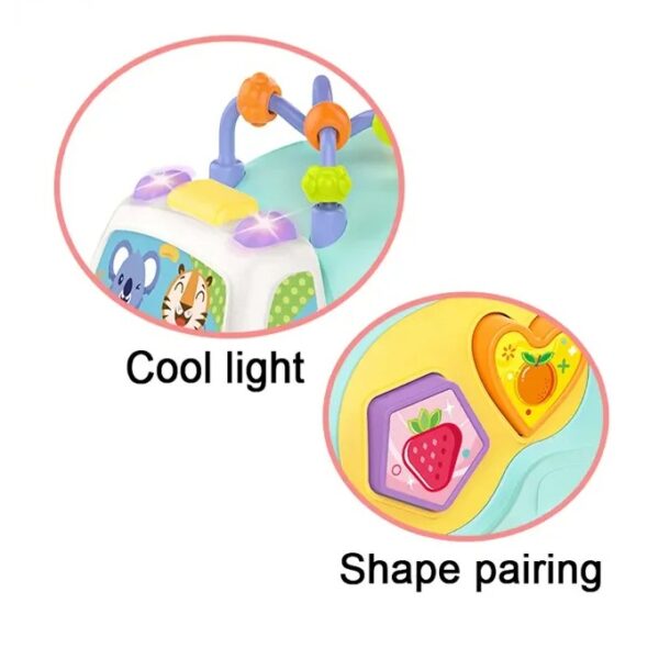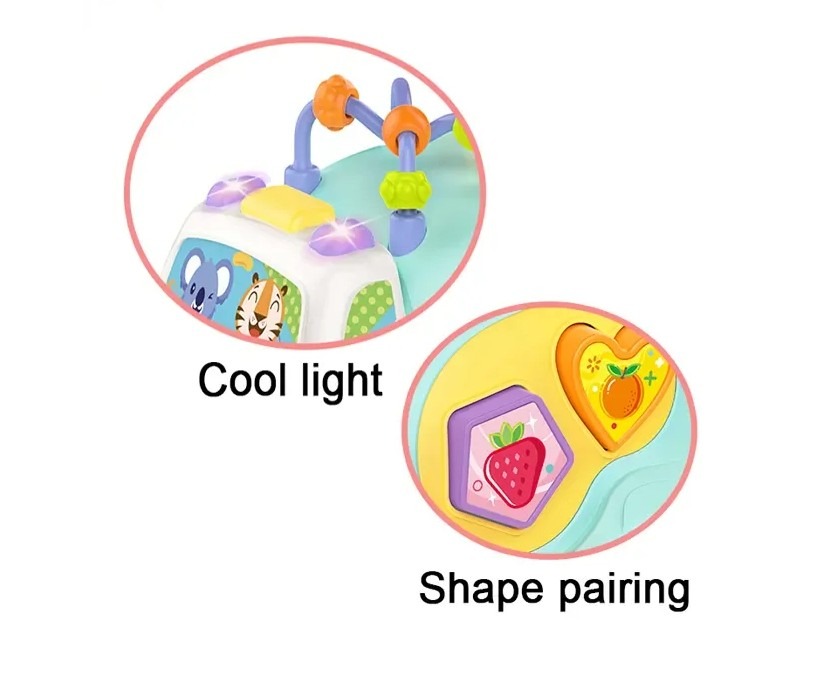 - Activități Interactive: Dotată cu un ciocănel roșu pentru a lovi bilele colorate (galben, verde, portocaliu) și un arc cu bile pe plafon pentru exersarea dexterității.