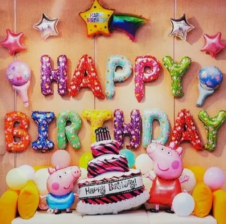 Baloane Happy Birthday cu imprimeu Peppa Pig, diferite culori, litera are 35 cm, lungimea totala a baloanelor umflate ajunge la 2,5 m
