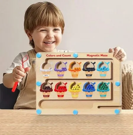 Copilul, cu ajutorul pixului magnetic, trebuie sa potriveasca bilutele de aceeasi culoare cu inghetata.