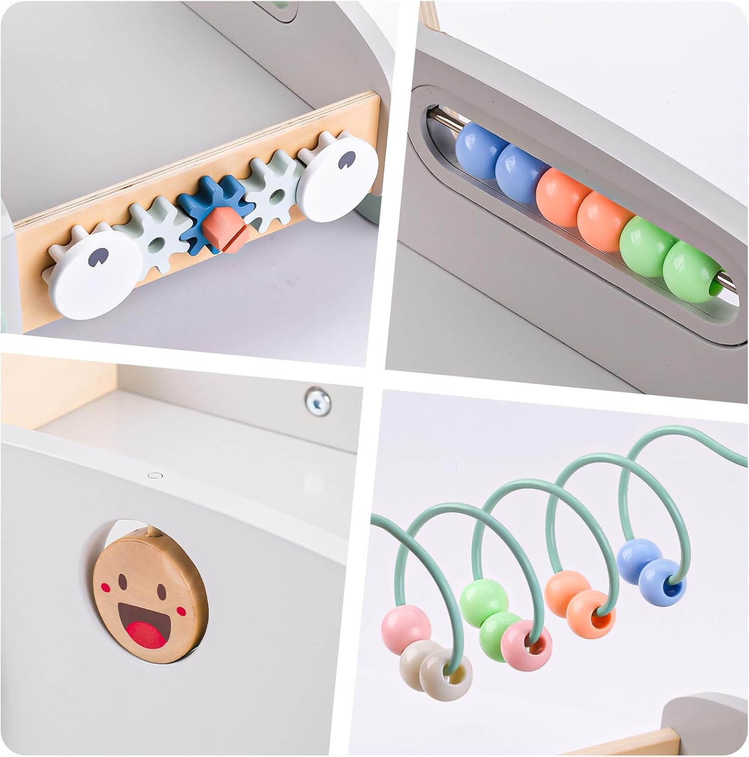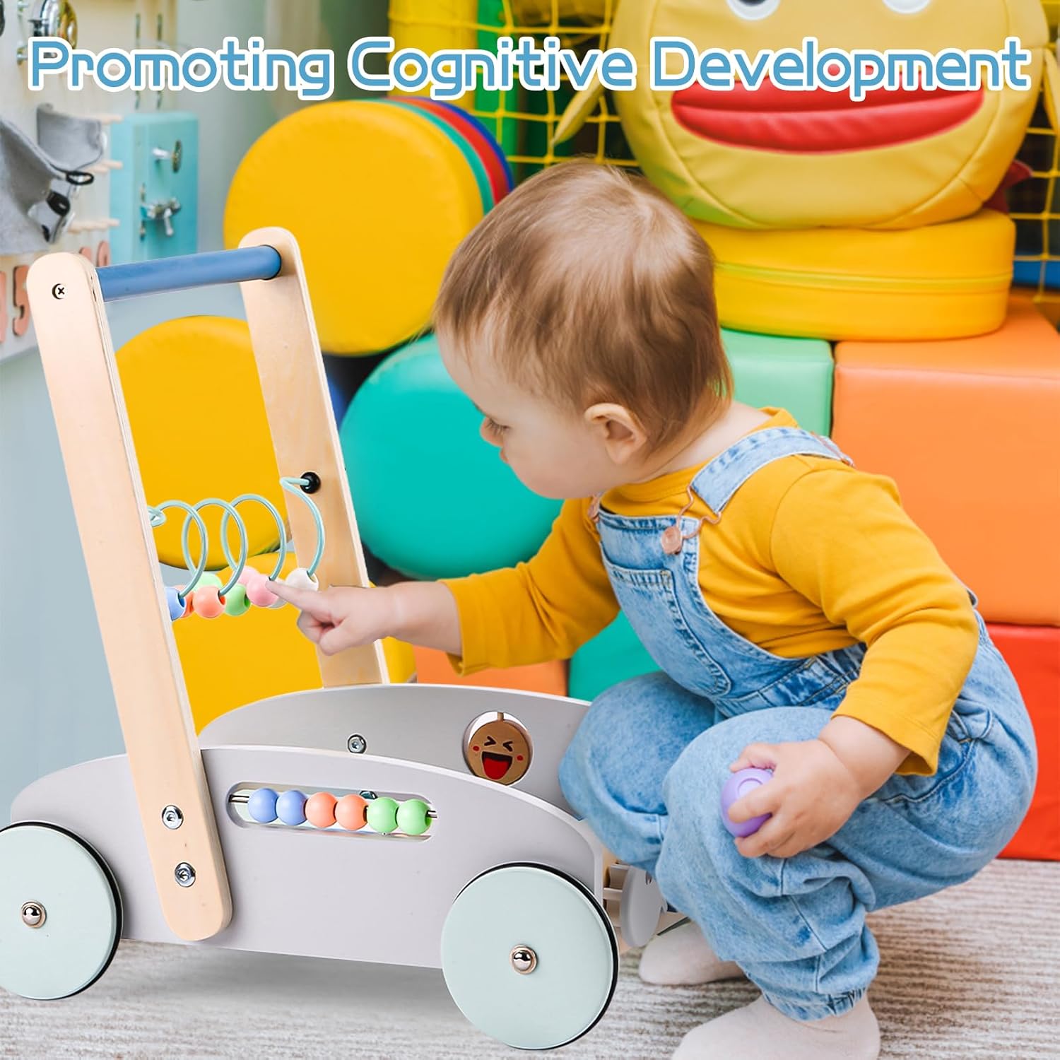 Caruciorul multifunctional ofera multe activitati distractive si educative pe langa faptul ca este un ajutor pentru mers: sortarea si stivuirea blocurilor, rotirea angrenajelor, rularea si rotirea margelelor, rotirea fetei zambitoare.