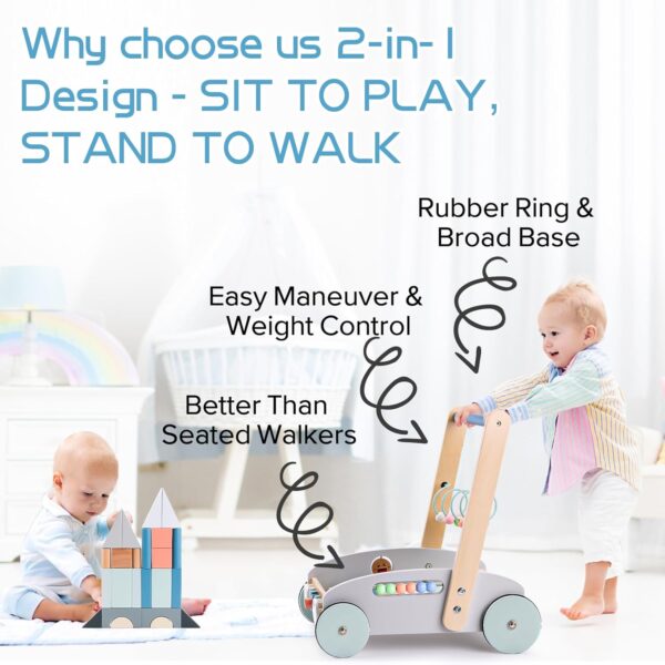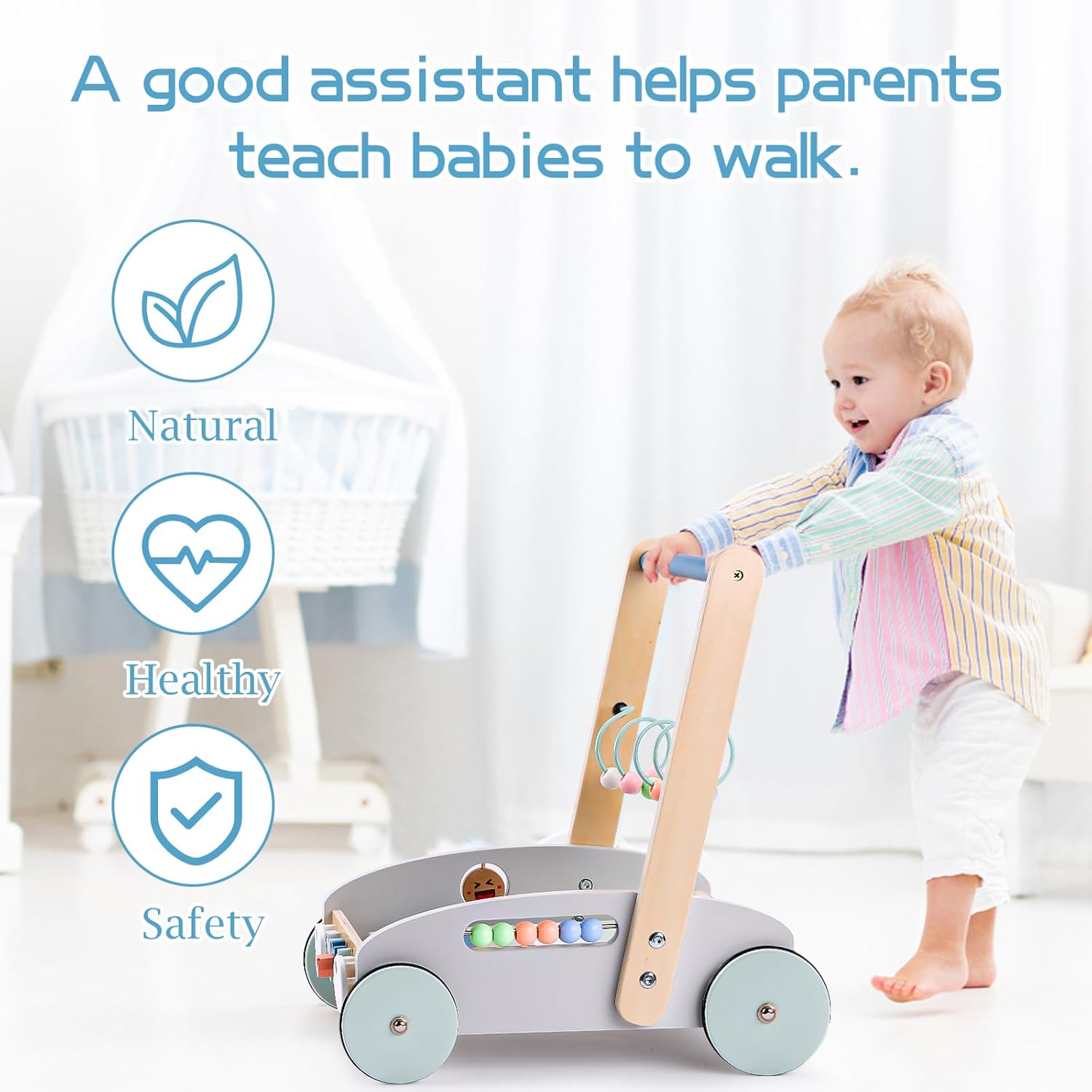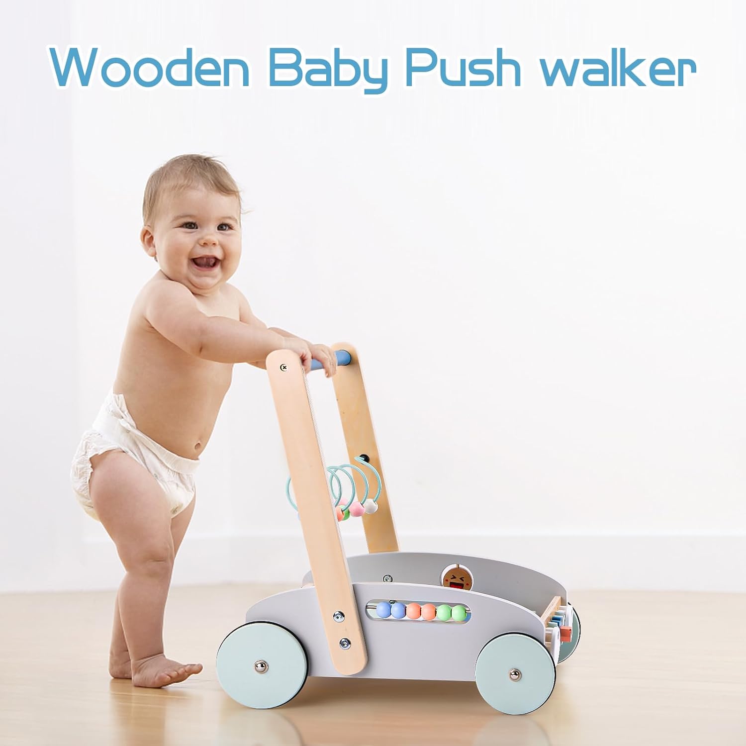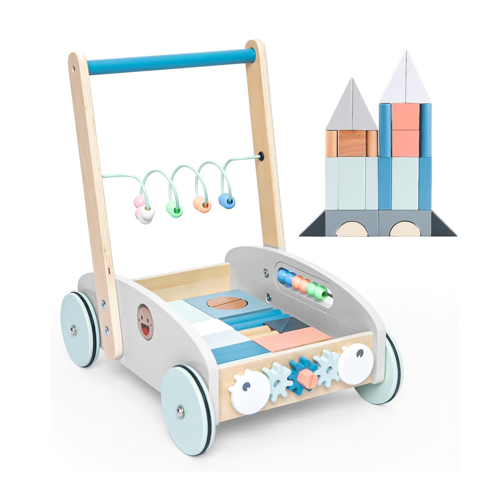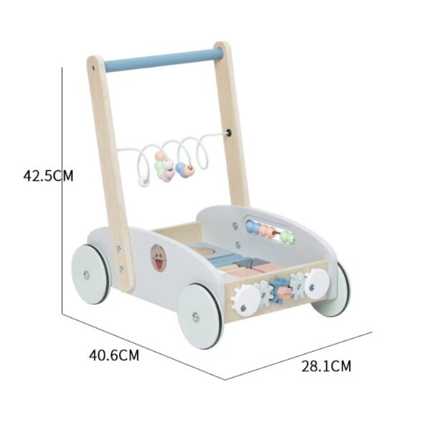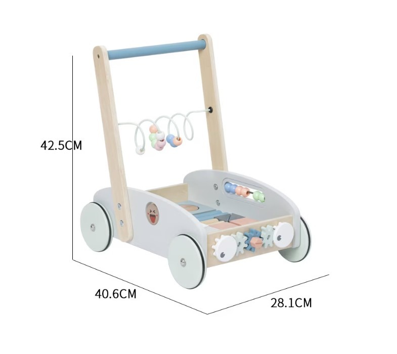 Carucior din lemn pentru copii cu centru de activitati integrat, insotitorul perfect pentru primii pasi si primele aventuri.