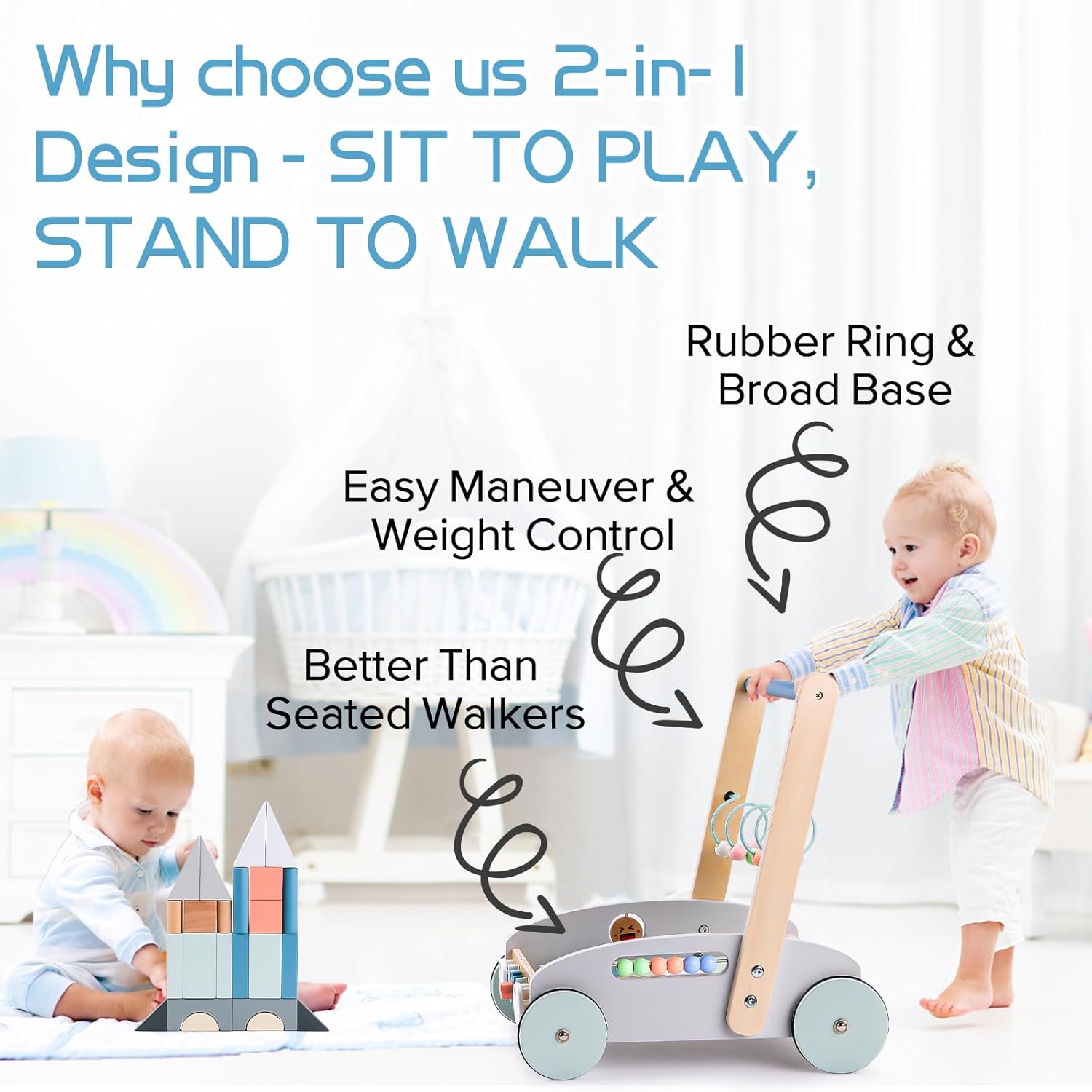Rotile prevazute cu banda de cauciuc ale premergatorului sunt concepute pentru a proteja podelele de zgarieturi, oferind stabilitate si o experienta de joaca fara griji.