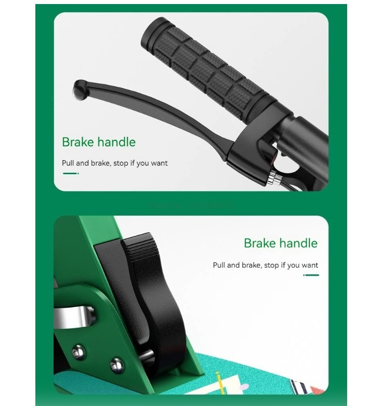 🔹 Sistem de frânare dublu – Echipată atât cu frână pe ghidon cât și cu frână pe roata din spate (tip clapetă acționată cu piciorul), oferă un plus de siguranță și control în orice situație.