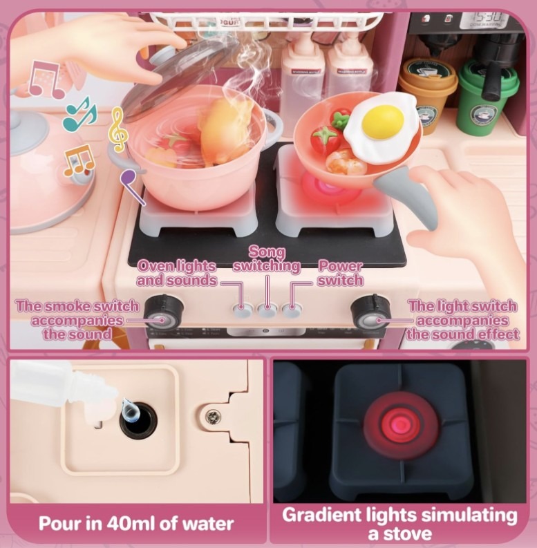 - Generator de Abur: Plita simulează procesul de gătire prin eliberarea unui abur rece (sigur pentru copii), adăugând un plus de realism jocului.