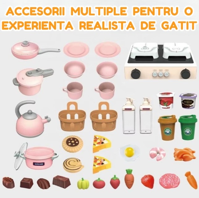 - Electrocasnice Incluse: Setul vine echipat cu blender, fierbător de ouă cu lumini și sunete, și chiar un meniu interactiv pentru a stimula imaginația.
