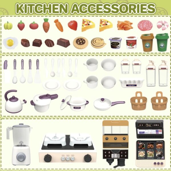 - Electrocasnice Incluse: Setul vine echipat cu blender, fierbător de ouă cu lumini și sunete, și chiar un meniu interactiv pentru a stimula imaginația.