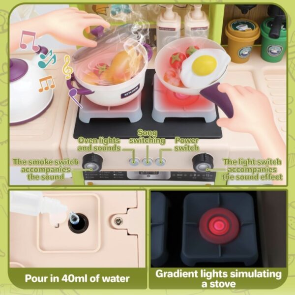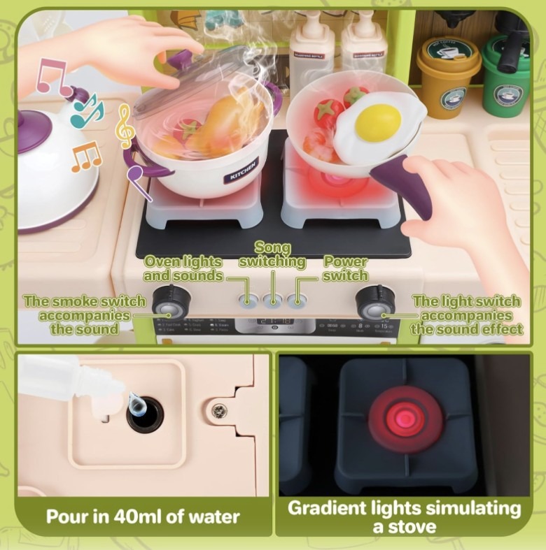 - Generator de Abur: Plita simulează procesul de gătire prin eliberarea unui abur rece (sigur pentru copii), adăugând un plus de realism jocului.