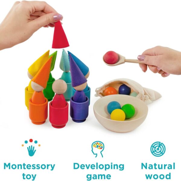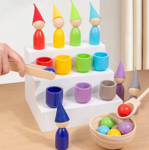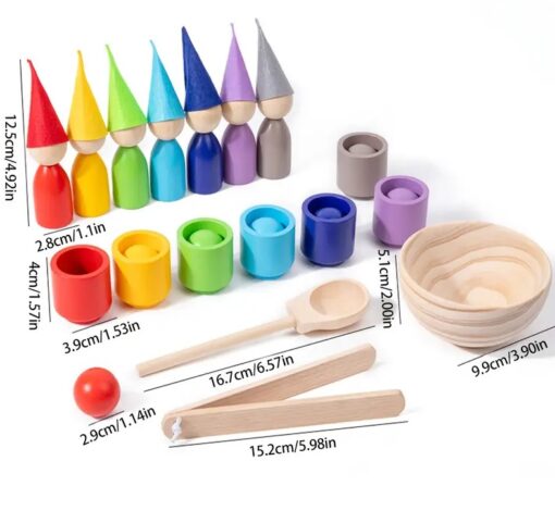 Copiii pot sorta culorile, potrivi păpușile în cupele corespunzătoare, sau inventa povești pline de imaginație cu micii „spiriduși din lemn”. O jucărie simplă, frumoasă și educativă — ideală pentru acasă, grădiniță sau ca cadou deosebit.