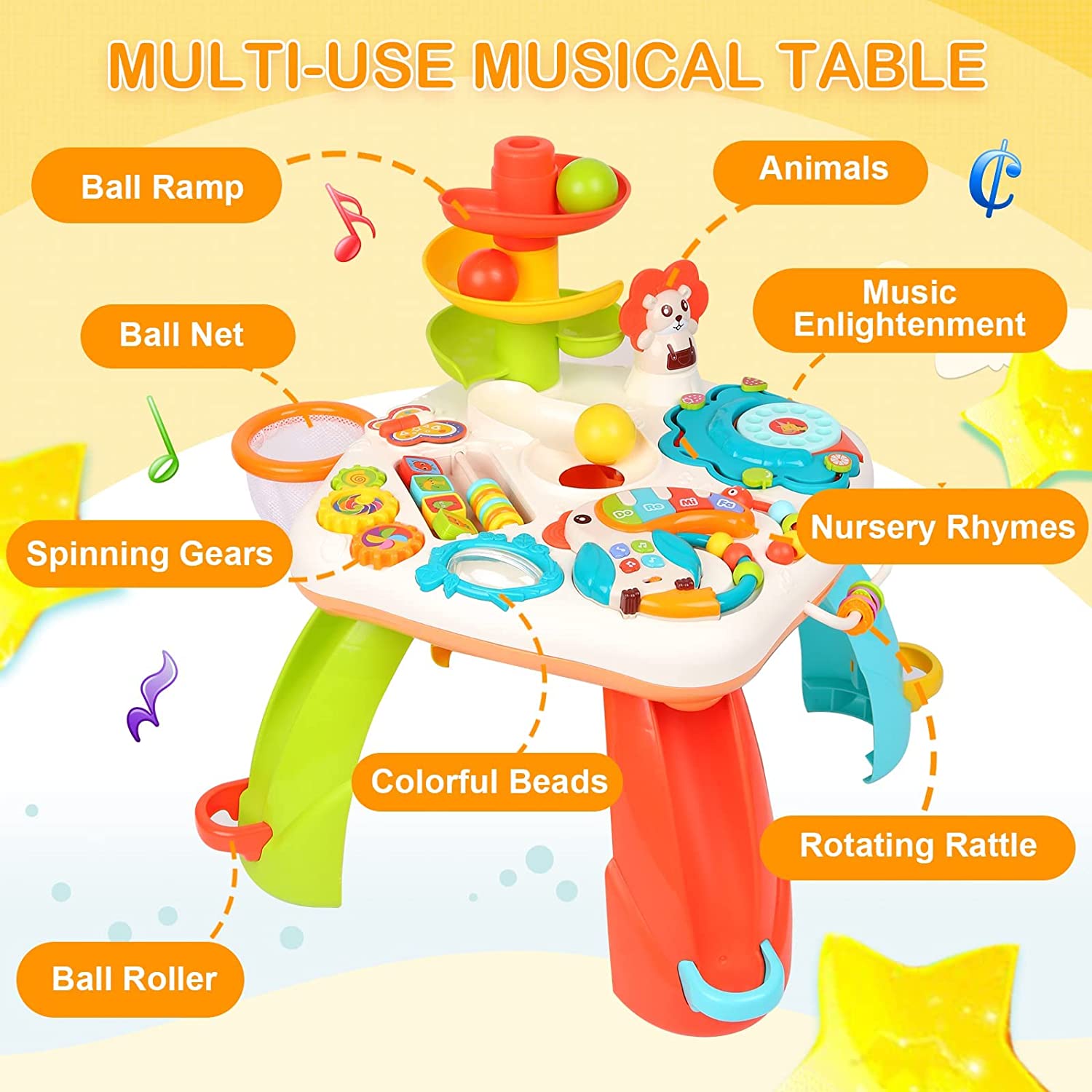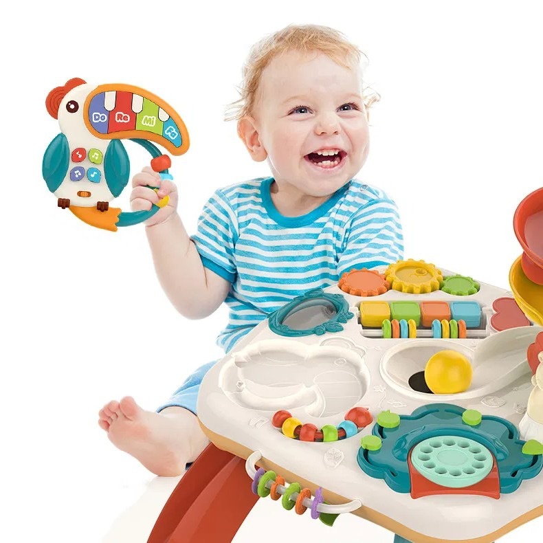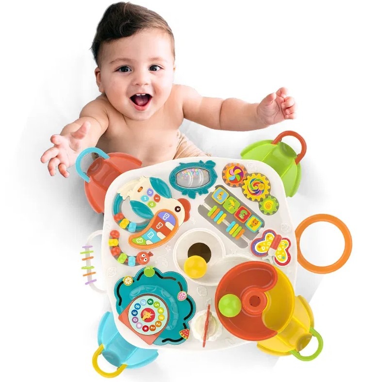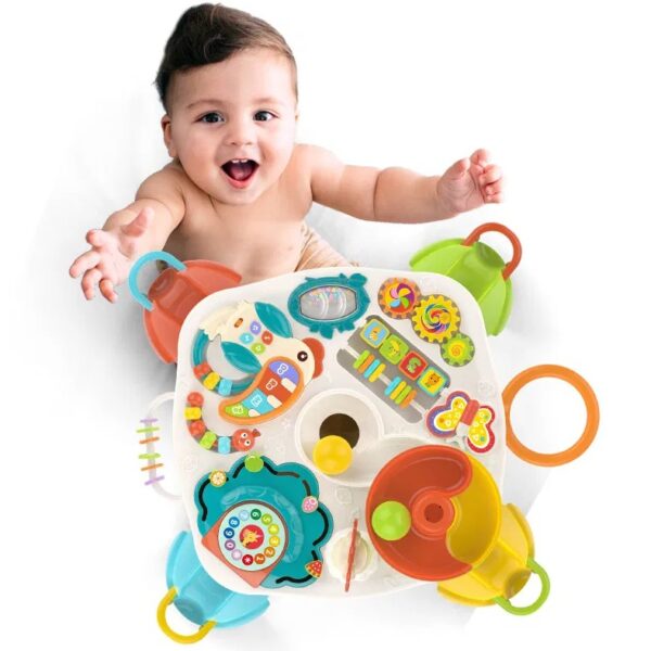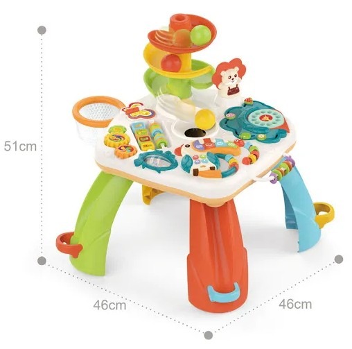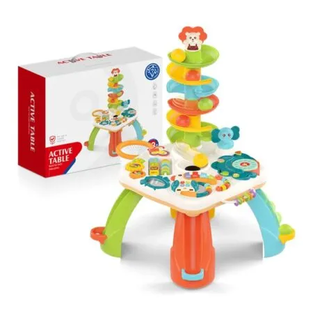 Măsuța interactivă Active Table este o jucărie educativă multifuncțională, concepută pentru a stimula dezvoltarea copilului prin joacă activă și distractivă. Cu un design colorat și multiple elemente interactive, aceasta încurajează coordonarea mână–ochi, motricitatea fină, gândirea logică și curiozitatea celor mici.