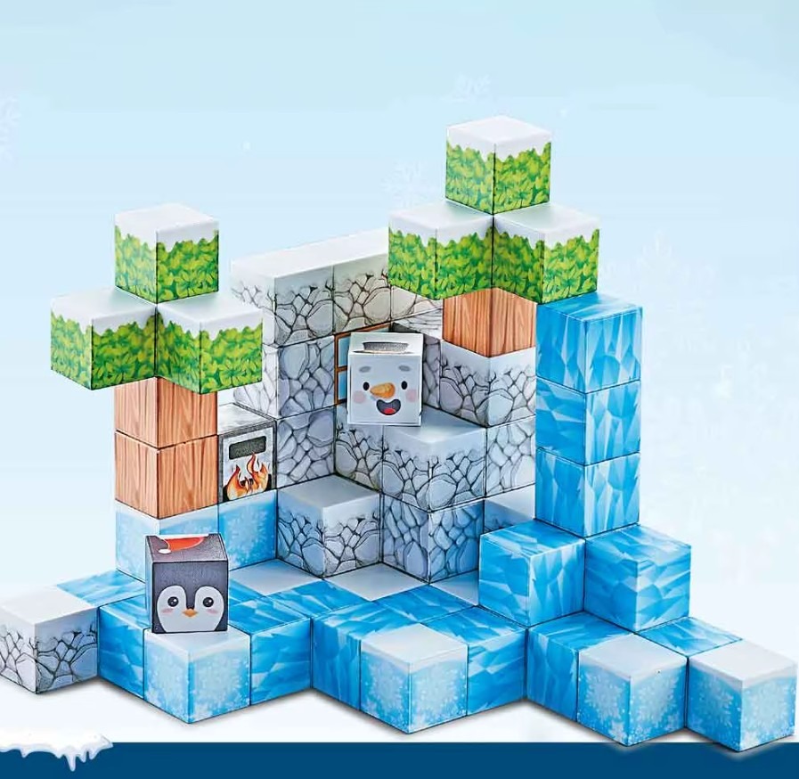 ✔ Design tematic „gheata” – texturi și culori ce imită rocile din lumea virtuală, perfecte pentru construirea de castele sau fortărețe.