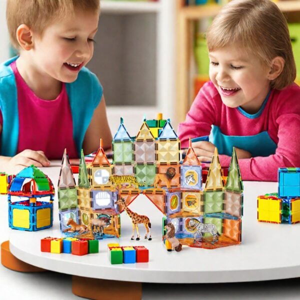 Piesele magnetice se imbina usor, permitand crearea unor structuri 2D si 3D, in timp ce animalutele incluse aduc viata fiecarei constructii
