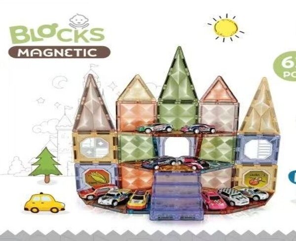 Acest set conține 62 de piese colorate care se conectează ușor prin magnetism, oferind ore întregi de distracție și învățare interactivă. Copiii pot construi castele, turnuri, garaje sau orice le trece prin imaginație, dezvoltându-și în același timp gândirea logică și coordonarea mână-ochi.