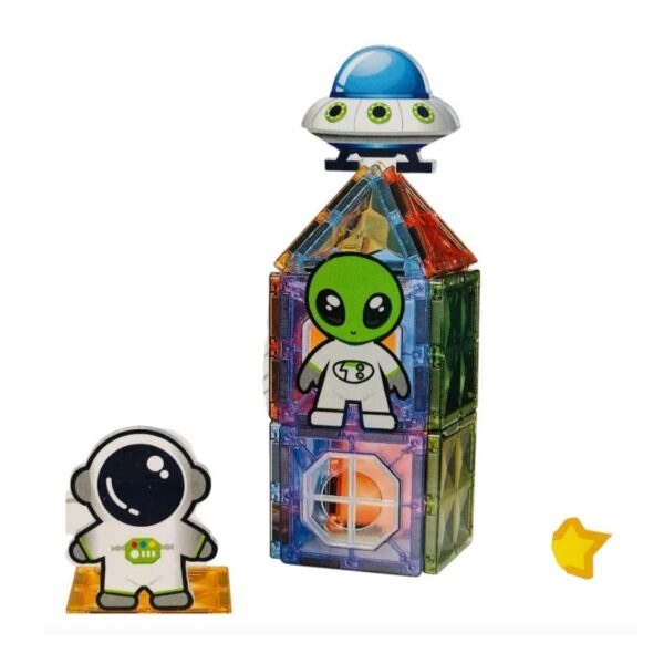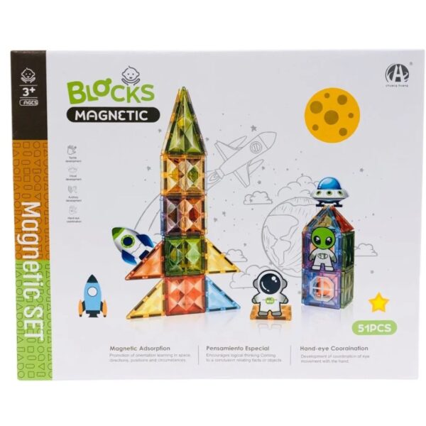 Lansează imaginația în spațiu! Acest set magnetic cu fațadă din sticlă, format din 51 de piese, cu tematică spațială, le permite copiilor să construiască nave spațiale, stații spațiale și decoruri din altă lume, dezvoltându-și în același timp abilitățile cognitive și motorii prin joc creativ.