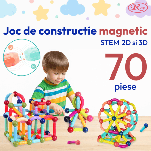 Acest set magnetic cu bile si tije colorate este perfect pentru micii constructori care vor sa creeze forme 2D si 3D, de la modele simple la structuri complexe. Fiecare piesa se conecteaza usor, oferind ore intregi de distractie interactiva, fara ecrane.