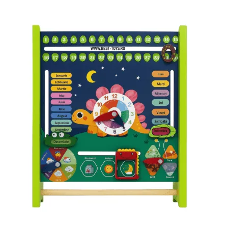 Fața educativă: include un ceas colorat pentru învățarea orelor, un calendar cu zilele lunii, secțiuni pentru vreme, anotimpuri și animale.