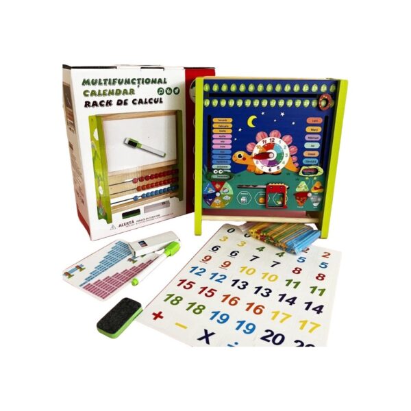 Tabla educativa din lemn 2-în-1 cu dinozaur și abac colorat – Ceas, zile, anotimpuri și numere