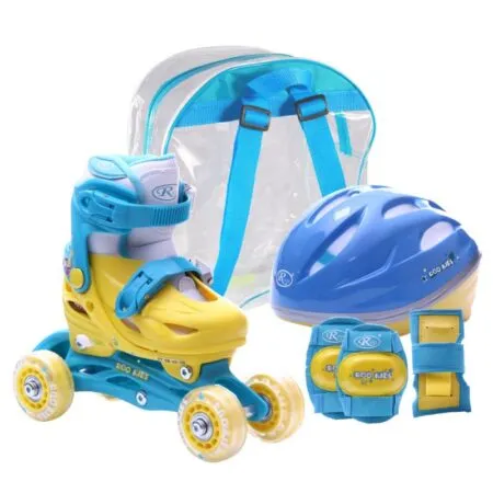 Pus intr-o gentuta, practica si usor de transportat, setul contine tot ce are nevoie copilul dumneavoastra pentru a se bucura de o plimbare pe role in conditii de siguranta si protectie: casca, cotiere, genunchiere si protectii pentru palme.