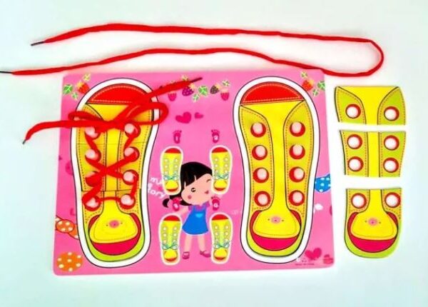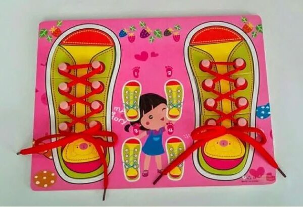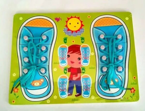 Jucarie din lemn – Invatam sa legam sireturi, este o jucarie ce dezvolta capacitati motrice ale copilului.