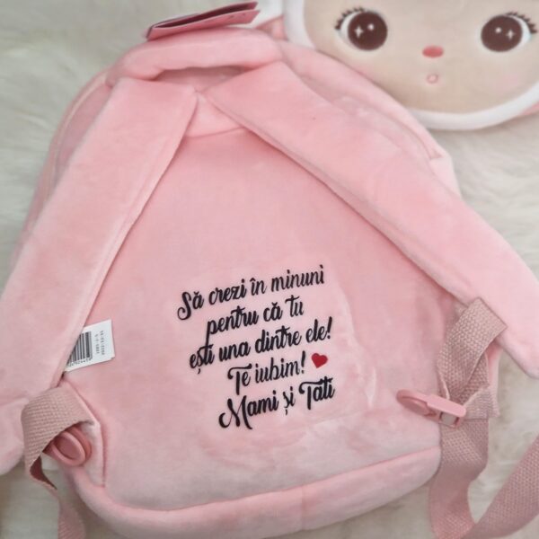 De asemenea se poate personaliza cu text pe urechiuse sau pe spatele ghiozdanului