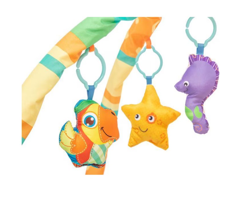 - Jucării Detasabile: Setul include 5 jucării interactive suspendate (precum steluța zâmbitoare și animale colorate) care încurajează copilul să se întindă, să apuce și să exploreze texturi diferite.